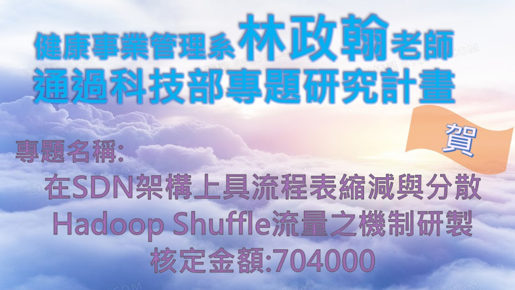 林恭喜林政翰老師通過科技部專題研究計畫,專題名稱:在SDN架構上具流程表縮減與分散Hadoop Shuffle流量之機制研製。核定金額:704000。