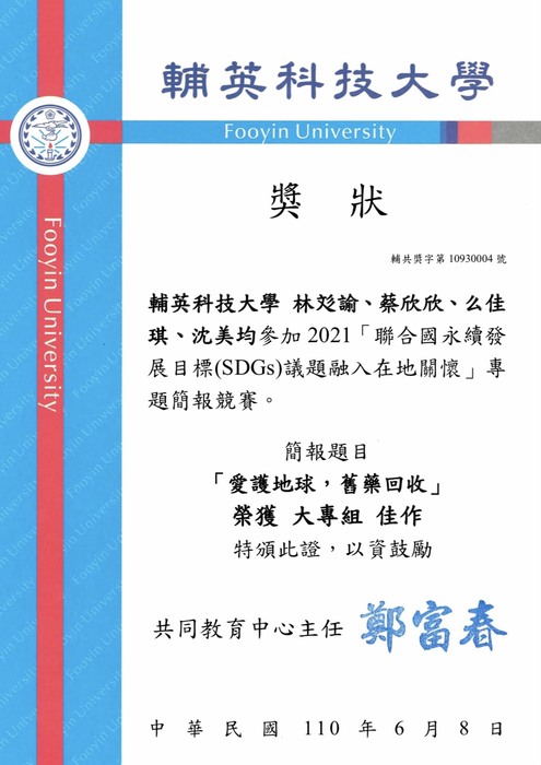 恭賀學生~~林彣諭、蔡欣欣、么佳琪、沈美均參加輔英科技大學舉辦的「2021 聯合國永續發展目標(SDGs)議題融入在地關懷 專題簡報競賽,獲得「大專組 佳作獎」,指導老師林政翰。
