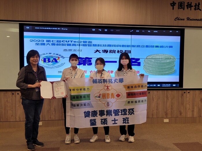 恭喜本系學生參加 2023第七屆CUTe企管盃全國大專校院暨高中職 智慧科技應用與創新服務企劃競賽 大專院校組榮獲第一名