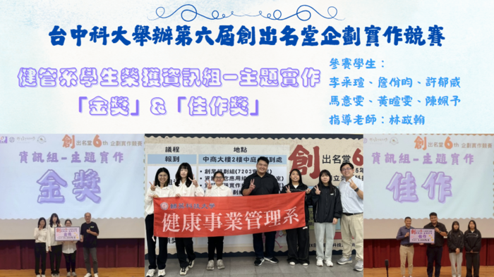 健管系學生參加台中科大舉辦的第六屆創出名堂企劃實作競賽,分別獲得「金獎」跟「佳作獎」